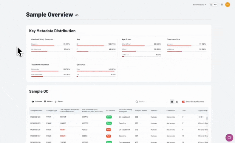The Sample QC dashboard lets you open Gating Plots for each sample, showing how cell populations and markers were defined. This provides transparency into the underlying data so you can validate results and troubleshoot issues.